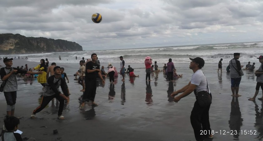 KESERUAN MENIKMATI PANTAI SAMBIL BERMAIN BOLA VOLLY